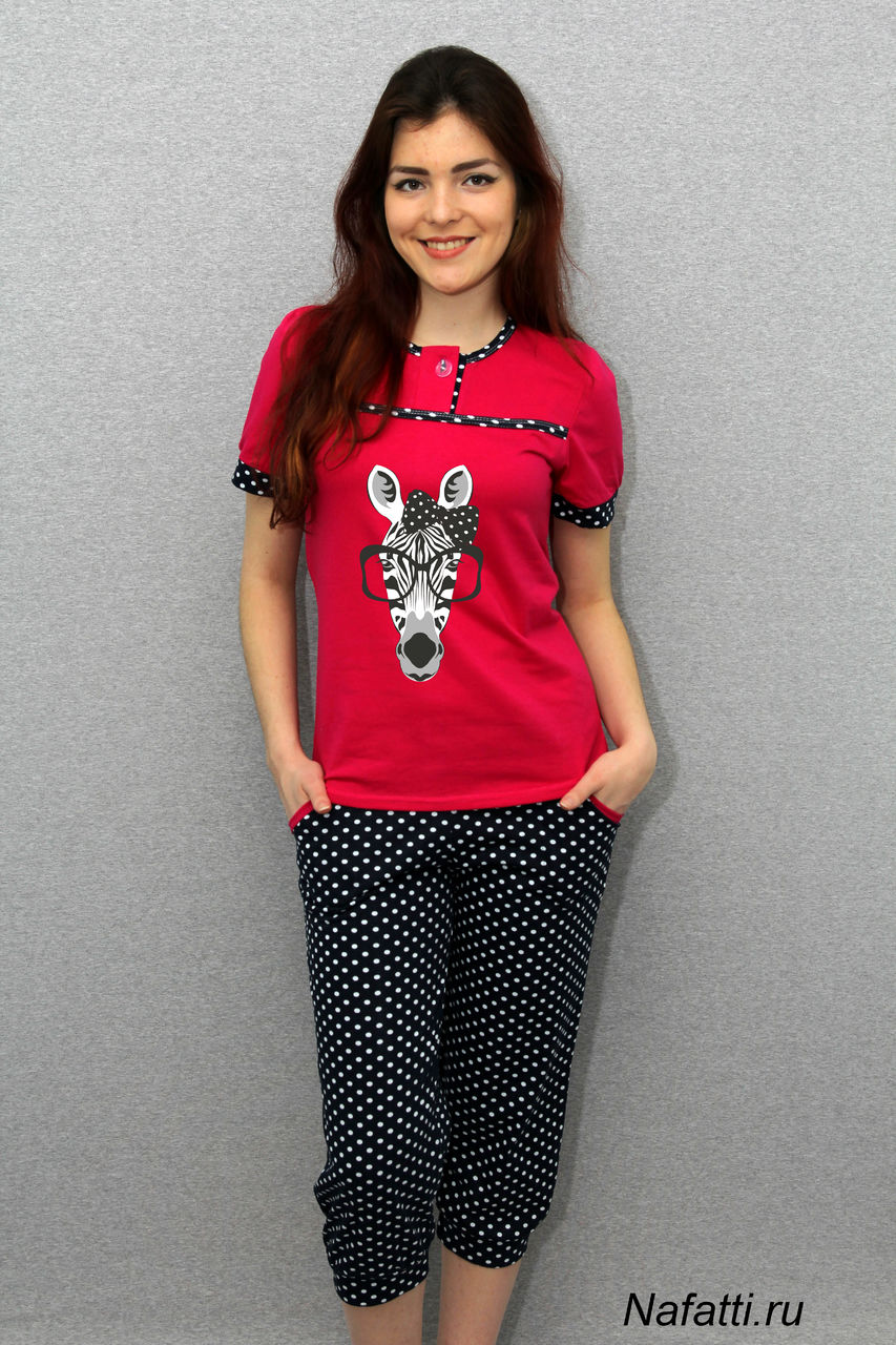 Очаровательный комплект состоящий из футболки и бридж. Футболка с округлым вырезом горловины на пуговице,имеет принт в области груди , оформлена контрастной окантовкой. Отличный вариант для домашнего отдыха.
