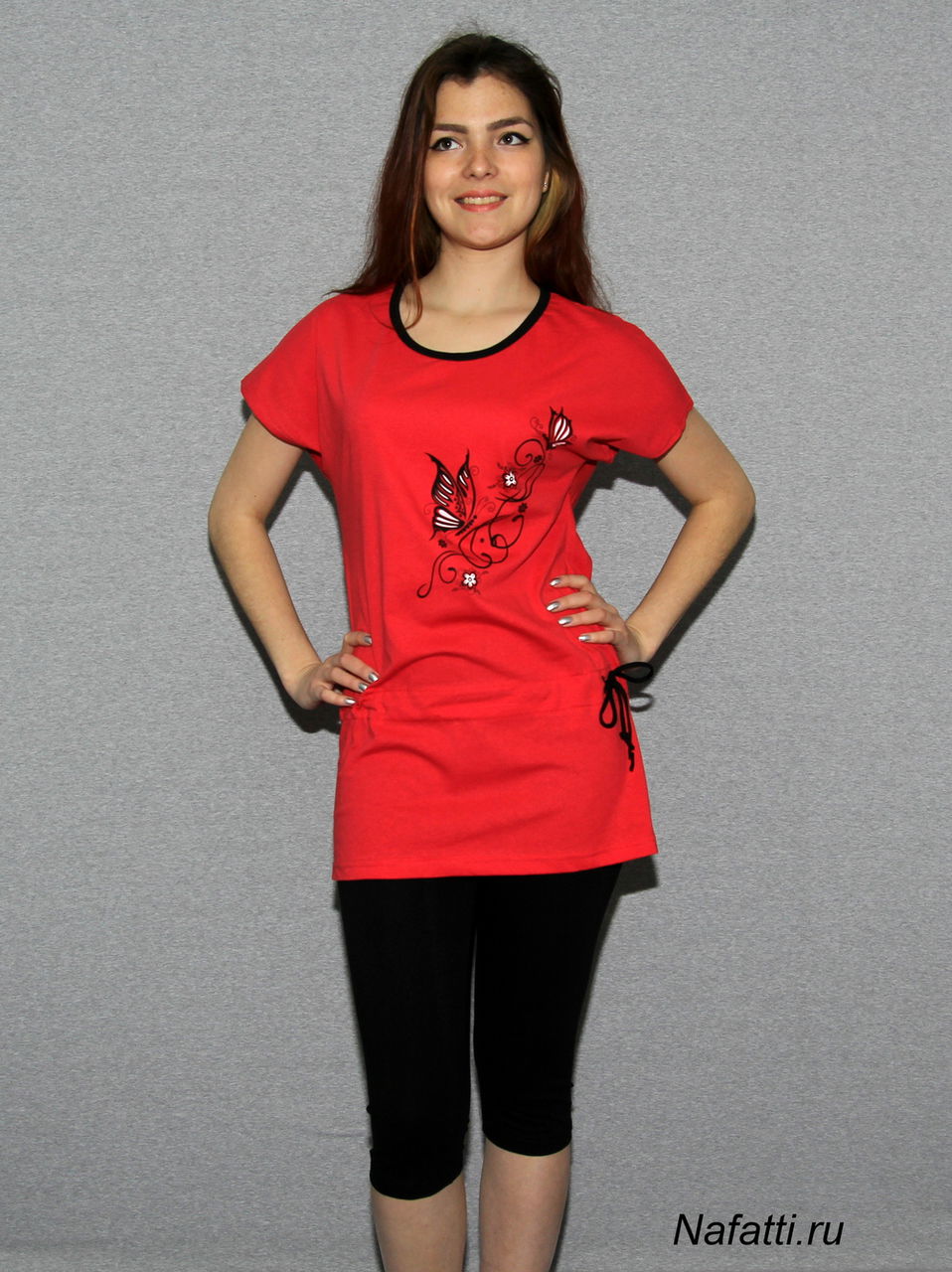 Очаровательный комплект, состоящий из туники и бридж. Туника с округлым вырезом горловины и короткими рукавами. Бриджи - черные, чуть ниже колен.