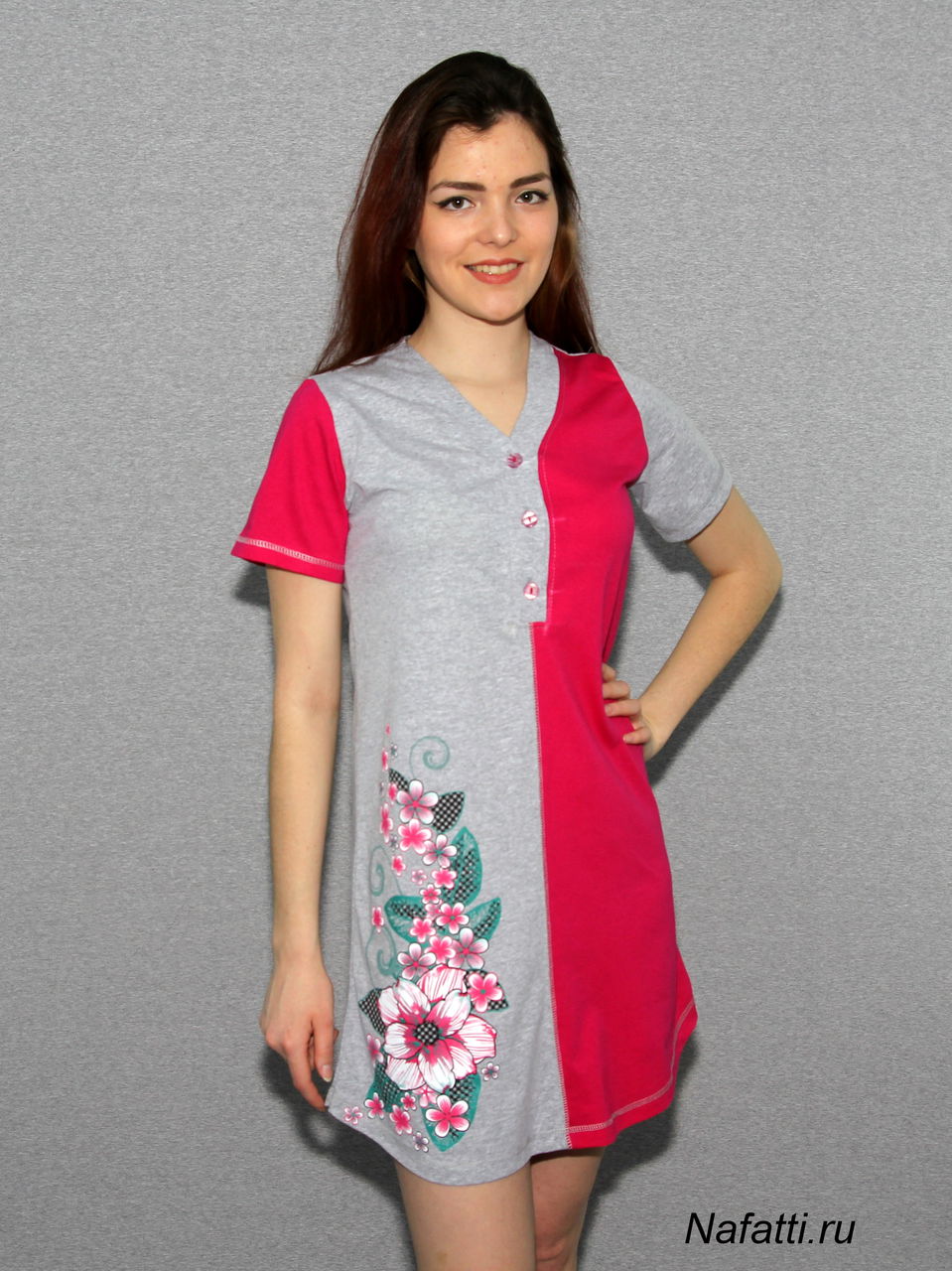 Яркая туника с боковым принтом, V-образный вырез с застежкой на пуговицах. Модель выполнена из трикотажа мягкого и приятного к телу.