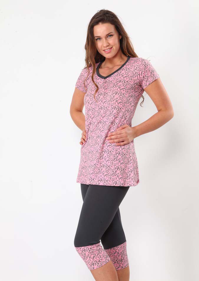 Замечательный комплект, футболка из запринтованного полотна и однотонные бриджи на манжете. Отличный вариант для домашнего гардероба.