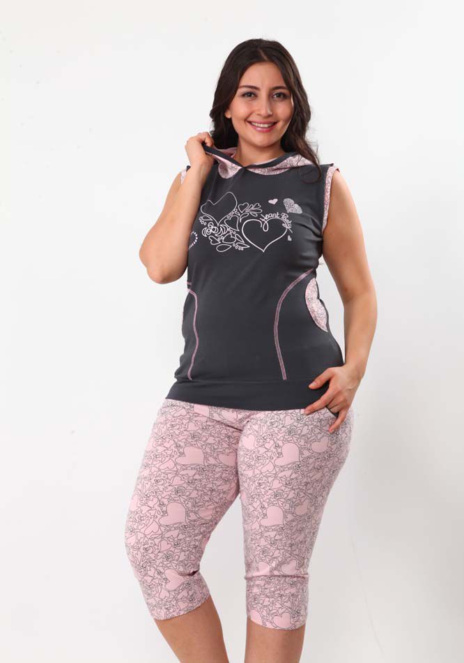 Очаровательный женский комплект, в состав которого входит футболка с капюшоном без рукава и облегающие бриджи с карманами.Подходит как для домашнего отдыха,так и для занятий спортом.