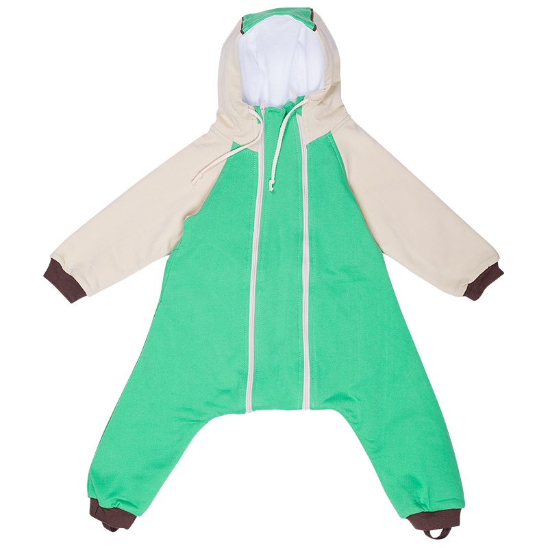 Сам комбинезон непродуваемый, молнии - с ветрозащитой, а капюшон - с завязками и высоким горлом. Всё это приятно дополняет основную особенность комбинезонов-бамбинизонов: возможность быстро и легко высаживать ребенка или менять подгузник на прогулке, в путешествии и дома.