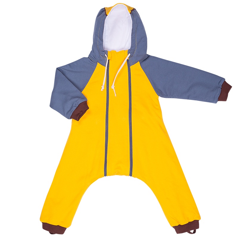 Сам комбинезон непродуваемый, молнии - с ветрозащитой, а капюшон - с завязками и высоким горлом. Всё это приятно дополняет основную особенность комбинезонов-бамбинизонов: возможность быстро и легко высаживать ребенка или менять подгузник на прогулке, в путешествии и дома.