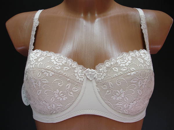 Бюстгальтер "балконет" с диагональным швом и чашечкой на тонкой поролоновой основе, сверху обтянутой эластичным кружевным полотном, нижняя деталь с Т-образным швом, на каркасах. Стан, бочка и спинка выполнены из эластичного полотна. Стан продублирован изнутри хлопковой основой. Высота бочка 7-10 см. Регулятор длинны брители сзади. Застежка от 75С,75D на одном крючке, от 75Е-90Е на два кручка, два варианта объема. Между чашечками на стане украшен маленьким бантиком.