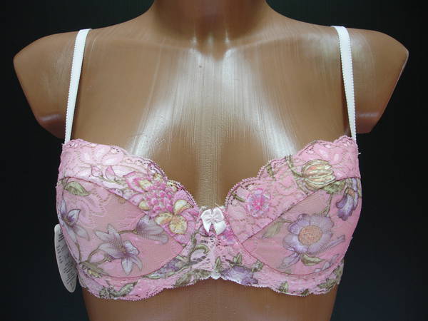 Бюстгальтер "балконет" с диагональным швом и чашечкой на тонкой поролоновой основе, сверху обтянутой эластичным кружевным полотном, на каркасах. Стан, бочка и спинка выполнены из эластичного кружевного полотна. Стан продублирован изнутри сетчатой основой. Высота бочка 7-10 см. Регулятор длинны брители сзади. Застежка от 75В-75D, 80В,С на одном крючке, от 75Е, 80D-85Е на два кручка, два варианта объема. Между чашечками на стане украшен маленьким бантиком.