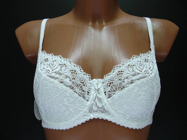 Бюстгальтер полупаралон с мягкой чашечкой и диагональным швом, нижняя деталь с Т-образным швом, на каркасах. Бюстгальтер на тонкой поролоновой основе обтянутой эластичным кружевным полотном в нижней части чашки, верхняя деталь чашки из эластичного кружевного полотна. Бочка и спинка выполнены из эластичного полотна. Стан выполнен из эластичного кружевного полотна и продублирован изнутри сетчатой основой. Высота бочка 7-9см. Регулятор длинны брители сзади. Застежка от 75С,75D на одном крючке, от 75Е - 90Е на два кручка, два варианта объема. Между чашечками на стане украшен маленьким бантиком.