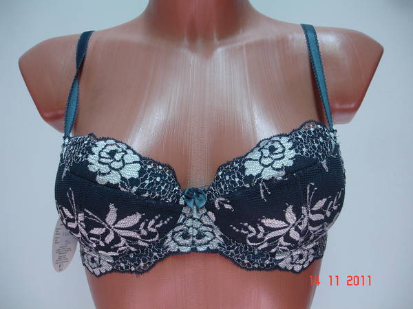 Бюстгальтер "пуш-ап" на средней перемычке с диагональным швом и чашечкой на тонкой поролоновой основе, сверху обтянутой эластичным кружевным полотном, на каркасах. Нижняя деталь с внутренней стороны с кармашком из хлопкового трикотажа, для вкладышей (съемные подушечки). Стан, бочка и спинка выполнены из эластичного кружевного полотна. Стан продублирован изнутри сетчатой основой. Высота бочка 7- 9см. Регулятор длинны брители сзади. Застежка от 75А - 75D на одном крючке, 75Е - 90С на два кручка, два варианта объема. Между чашечками на стане украшен маленьким бантиком.