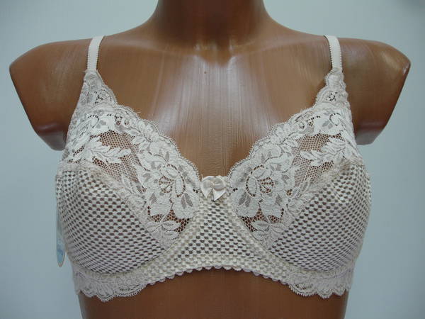 Бюстгальтер с мягкой чашечкой и диагональным швом из эластичного кружевного полотна, на каркасах. Нижняя часть чашечки продублирована изнутри сетчатой основой. Стан, бочка и спинка выполнены из эластичного кружевного полотна. Стан продублирован изнутри сетчатой основой. Высота бочка 9-11 см. Регулятор длинны брители сзади. Застежка от 75В-75D на одном крючке, от 75Е, 80В- 85Е на два кручка, два варианта объема. Между чашечками на стане украшен маленьким бантиком.
