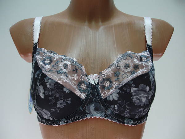 Бюстгальтер полупаралон с мягкой чашечкой и диагональным швом, нижняя деталь с Т-образным швом, на каркасах. Бюстгальтер на тонкой поролоновой основе обтянутой эластичным полотном в нижней части чашки, верхняя деталь чашки из сеточки с очень красивой вышивкой. Стан, бочка и спинка выполнены из эластичного полотна. Стан продублирован изнутри сетчатой основой. Высота бочка 7-9см. Регулятор длинны брители сзади. Застежка от 75С,75D на одном крючке, от 75Е - 90Е на два кручка, два варианта объема. Между чашечками на стане украшен маленьким бантиком.