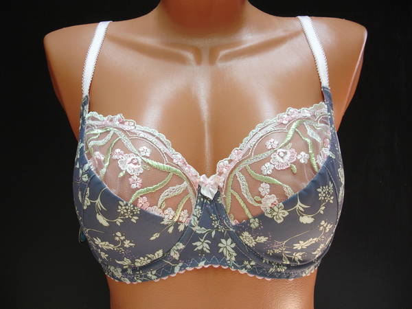 Бюстгальтер полупаралон с мягкой чашечкой и диагональным швом, нижняя деталь с Т-образным швом, на каркасах. Бюстгальтер на тонкой поролоновой основе обтянутой эластичным полотном в нижней части чашки, верхняя деталь чашки из сеточки с очень красивой вышивкой. Стан, бочка и спинка выполнены из эластичного полотна. Стан продублирован изнутри сетчатой основой. Высота бочка 7- 9см. Регулятор длинны брители сзади. Застежка от 75С,75D на одном крючке, от 75Е - 90Е на два кручка, два варианта объема. Между чашечками на стане украшен маленьким бантиком.