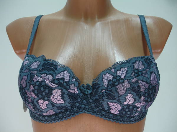 Бюстгальтер "пуш-ап" на средней перемычке с диагональным швом и чашечкой на тонкой поролоновой основе, сверху обтянутой эластичным кружевным полотном, на каркасах. Нижняя деталь с внутренней стороны с кармашком из хлопкового трикотажа, для вкладышей (съемные подушечки). Стан, бочка и спинка выполнены из эластичного кружевного полотна. Стан продублирован изнутри сетчатой основой. Высота бочка 7- 9см. Регулятор длинны брители сзади. Застежка от 75А - 75D на одном крючке, 75Е - 90С на два кручка, два варианта объема. Между чашечками на стане украшен маленьким бантиком.
