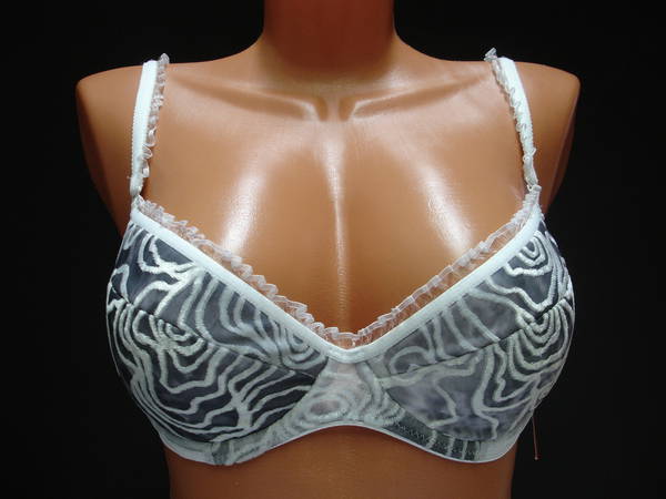 Бюстгальтер "пуш-ап" на средней перемычке, с диагональным швом и чашечкой на тонкой поролоновой основе, сверху обтянутой бархатным полотном, на каркасах. Нижняя деталь с внутренней стороны с кармашком из хлопкового трикотажа, для вкладышей (съемные подушечки). Бочка и спинка выполнены из сетчатого полотна. Стан выполнен из бархатного полотна и продублирован изнутри хлопковой основой. Съемная бретель позволяет адаптировать бюстгальтер практически к любому наряду. Передняя часть брители и верхний край бюстгальтера