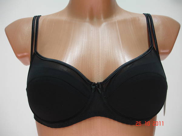 Бюстгальтер гладкий с диагональным швом и чашечкой на тонкой поролоновой основе, сверху обтянутой эластичным сетчатым полотном, на каркасах. Стан, бочка и спинка выполнены из эластичного сетчатого полотна. Стан продублирован изнутри сетчатой основой. Высота бочка 5 - 8 см. Регулятор длинны бретели сзади. Застежка на 75А, 75В и 80В на одном крючке, 75D, 80С, 80D и 85С на два крючка, два варианта объема. Между чашечками на стане украшен маленьким бантиком.