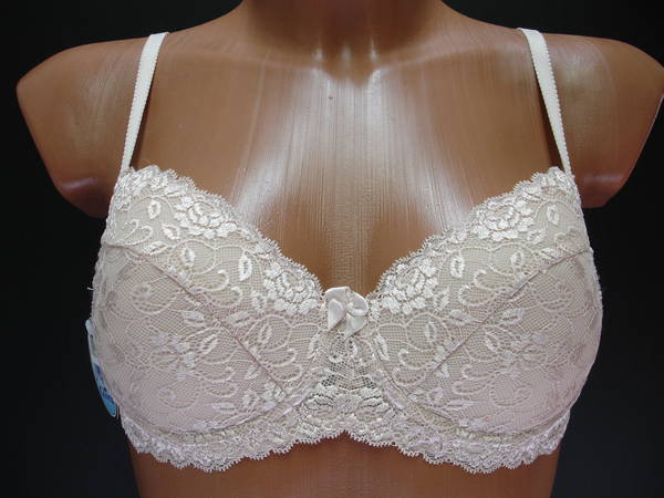 Бюстгальтер "балконет" с диагональным швом и чашечкой на тонкой поролоновой основе, сверху обтянутой эластичным кружевным полотном, на каркасах. Стан, бочка и спинка выполнены из эластичного кружевного полотна. Стан продублирован изнутри сетчатой основой. Высота бочка 7-10 см. Регулятор длинны бретели сзади. Застежка от 75В-75D, 80В,С на одном крючке, от 75Е, 80D-85Е на два крючка, два варианта объема. Между чашечками на стане украшен маленьким бантиком.