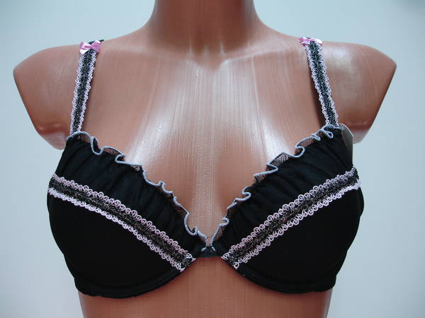Бюстгальтер "пуш-ап" на тонкой перемычке, с диагональным швом и чашечкой на тонкой поролоновой основе, сверху обтянутой сетчатым полотном, на каркасах. Диагональный шов украшен очень красивой тесьмой. Нижняя деталь с внутренней стороны с кармашком из хлопкового трикотажа, для вкладышей (съемные подушечки). Бочка и спинка выполнены из сетчатого полотна. Высота бочка 6- 7см. Передняя часть бретели обтянута очень красивой тесьмой, спереди бретель украшена маленьким бантиком. Задняя часть бретели выполнена из эластичной тесьмы. Регулятор длинны бретели сзади. Застежка от 75А - 75D, 80В на одном крючке, 80С, 80D на два крючка, два варианта объема.