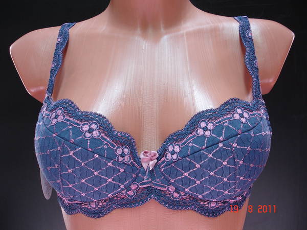 Бюстгальтер "пуш-ап" на средней перемычке с диагональным швом и чашечкой на тонкой поролоновой основе, сверху обтянутой эластичным кружевным полотном, на каркасах. Нижняя деталь с внутренней стороны с кармашком из хлопкового трикотажа, для вкладышей (съемные подушечки). Стан, бочка и спинка выполнены из эластичного кружевного полотна. Стан продублирован изнутри сетчатой основой. Высота бочка 7- 9см. Регулятор длинны бретели сзади. Застежка от 75А - 75D на одном крючке, 75Е - 90С на два крючка, два варианта объема. Между чашечками на стане украшен маленьким бантиком.