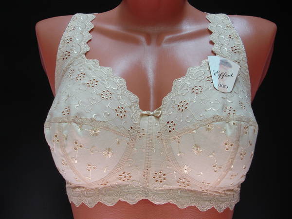 Бюстгальтер с мягкой чашечкой и диагональным швом, нижняя деталь с Т-образным швом из хлопкового полотна и хлопкового кружевного полотна, без каркасов. Нижняя часть чашечки продублирована изнутри хлопковой основой. Стан выполнены из хлопкового кружевного полотна и продублирован изнутри хлопковой основой. Бочек и спинка выполнены из хлопкового полотна и продублированы изнутри хлопковой основой. Передняя часть бретели выполнена из хлопкового кружевного полотна. Задняя часть бретели выполнена из эластичной тесьмы. Регулятор длинны бретели спереди. Застежка на два крючка, два варианта объема. Между чашечками на стане украшен маленьким бантиком.