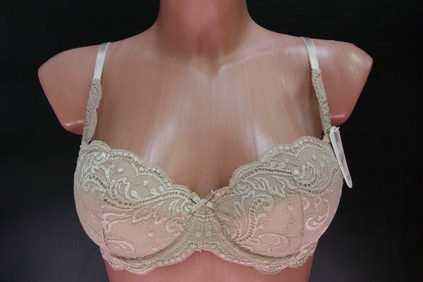 Бюстгальтер "пуш-ап" на средней перемычке, с диагональным швом и чашечкой на тонкой поролоновой основе, сверху обтянутой эластичным кружевным полотном, на каркасах. Нижняя деталь с внутренней стороны с кармашком из хлопкового трикотажа, для вкладышей (съемные подушечки). Бочка и спинка выполнены из эластичного кружевного полотна.Высота бочка 6- 7см. Регулятор длинны бретели сзади. Застежка от 75В - 75D,80В на одном крючке, 75Е,80С-80Е,85В,85С на два крючка,два варианта объема. Между чашечками на стане украшен маленьким бантиком.