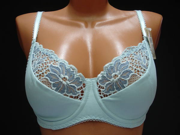 Бюстгальтер полупоролон с мягкой чашечкой и диагональным швом, нижняя деталь с Т-образным швом, на каркасах. Бюстгальтер на тонкой поролоновой основе в нижней части чашки, верхняя деталь чашки из эластичного кружевного полотна. Стан, бочка и спинка выполнены из эластичного полотна. Стан продублирована изнутри хлопковой основой. Высота бочка 7- 9см. Регулятор длинны бретели сзади. Застежка на два крючка, два варианта объема. Между чашечками на стане украшен маленьким бантиком.