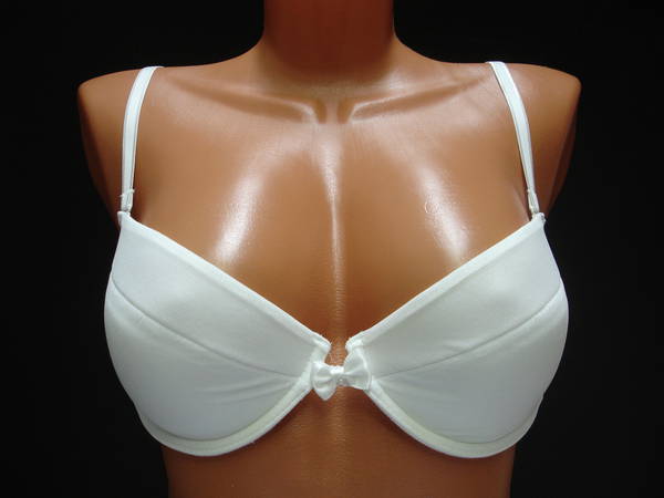 Бюстгальтер "пуш-ап" на тонкой перемычке, с диагональным швом и чашечкой на тонкой поролоновой основе, сверху обтянутой сетчатым полотном, на каркасах. Нижняя деталь с внутренней стороны с кармашком из хлопкового трикотажа, для вкладышей (съемные подушечки). Бочка и спинка выполнены из сетчатого полотна. Съемная бретель позволяет адаптировать бюстгальтер практически к любому наряду. Регулятор длинны бретели сзади. Высота бочка 6- 7см. Застежка на одном крючке, два варианта объема. Между чашечками на стане украшен маленьким бантиком.