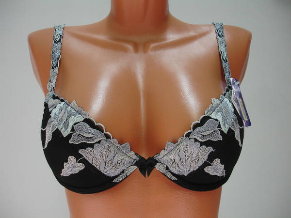 Бюстгальтер "пуш-ап" на тонкой перемычке, с диагональным швом и чашечкой на тонкой поролоновой основе, сверху обтянутой эластичным кружевным полотном, на каркасах. Нижняя деталь с внутренней стороны с кармашком из хлопкового трикотажа, для вкладышей (съемные подушечки). Бочка и спинка выполнены из эластичного полотна. Высота бочка 6- 7см. Регулятор длинны бретели сзади. Застежка на одном крючке, два варианта объема. Между чашечками на стане украшен маленьким бантиком.