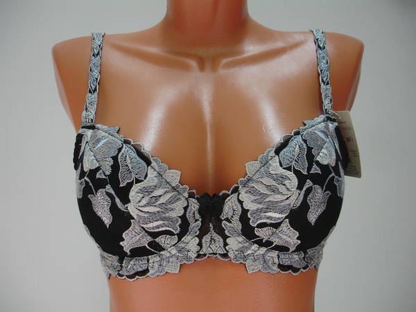 Бюстгальтер "балконет" на средней перемычке с диагональным швом и чашечкой на тонкой поролоновой основе, сверху обтянутой эластичным кружевным полотном, на каркасах. Стан и бочка выполнены из эластичного кружевного полотна. Стан продублирован изнутри сетчатой основой. Спинка бюстгальтера из эластичного полотна. Высота бочка 7-10 см. Регулятор длинны бретели сзади. Застежка на одном крючке, два варианта объема. Между чашечками на стане украшен маленьким бантиком.