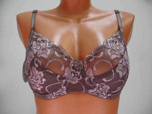 Бюстгальтер полупоролон с мягкой чашечкой и диагональным швом, нижняя деталь с Т-образным швом, на каркасах. Бюстгальтер на тонкой поролоновой основе обтянутой эластичным кружевным полотном в нижней части чашки, верхняя деталь чашки из эластичного кружевного полотна. Бочка и спинка выполнены из эластичного полотна. Стан выполнен из эластичного кружевного полотна и продублирован изнутри сетчатой основой. Высота бочка 7- 9см. Регулятор длинны бретели сзади. Застежка от 75С, 75D на одном крючке, от 75Е - 90Е на два крючка, два варианта объема. Между чашечками на стане украшен маленьким бантиком.