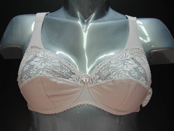 Бюстгальтер с мягкой чашечкой и диагональным швом, нижняя деталь - с Т-образным швом из эластичного полотна и эластичного кружевного полотна, на каркасах. Нижняя часть чашечки продублирована изнутри хлопковой основой. Стан, бочка и спинка выполнены из плотного эластичного полотна. Высота бочка 9- 10 см. Бюстгальтер имеет широкие разгрузочные бретели не сворачивающиеся и не стесняющие движений, которые снимают напряжение в области плеч и шеи благодаря уплотненной вставке из тонкого поролона. Бретель обтянута основной тканью. Задняя часть бретели выполнена из эластичной тесьмы. Регулятор длинны бретели сзади. Застежка на два крючка, два варианта объема. Между чашечками на стане украшен маленьким бантиком.