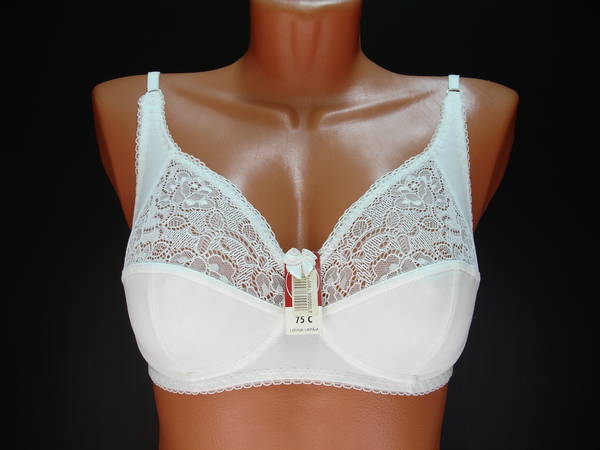 не эластичного кружевного полотна в верхней части чашечки, без каркасов. Нижняя часть чашечки продублирована изнутри хлопковой основой. Спинка и стан выполнены из эластичного полотна. Бочек из эластичного полотна. Регулятор длинны брители сзади. Застежка на два кручка, два варианта объема. Между чашечками на стане украшен