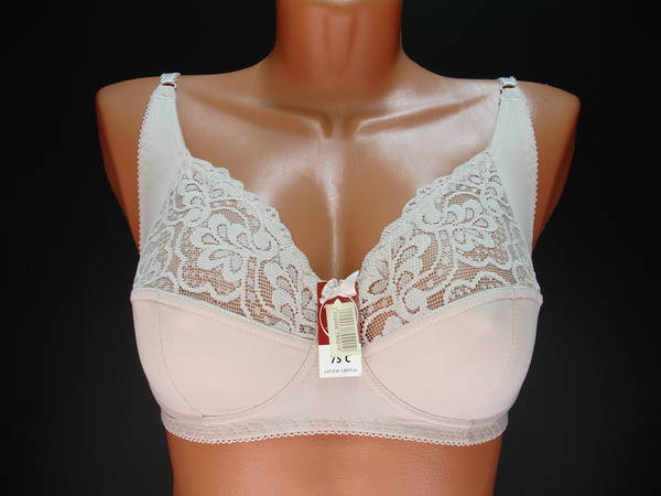 не эластичного кружевного полотна в верхней части чашечки, без каркасов. Нижняя часть чашечки продублирована изнутри хлопковой основой. Спинка и стан выполнены из эластичного полотна. Бочек из эластичного полотна. Регулятор длинны брители сзади. Застежка на два кручка, два варианта объема. Между чашечками на стане украшен