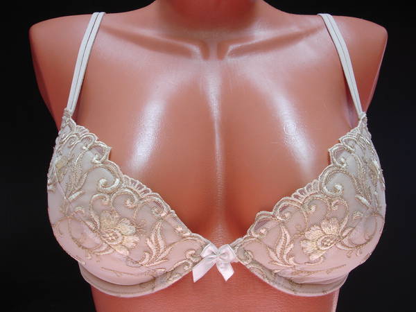 Бюстгальтер "пуш-ап" на тонкой перемычке, с диагональным швом и чашечкой на тонкой поролоновой основе, сверху обтянутой эластичным кружевным полотном, на каркасах. Нижняя деталь с внутренней стороны с кармашком из хлопкового трикотажа, для вкладышей (съемные подушечки). Бочка и спинка выполнены из эластичного кружевного полотна. Высота бочка 6- 7см. Регулятор длинны бретели сзади. Застежка от 75С, 80В на одном крючке, 80С на два крючка, два варианта объема. Между чашечками на стане украшен маленьким бантиком.