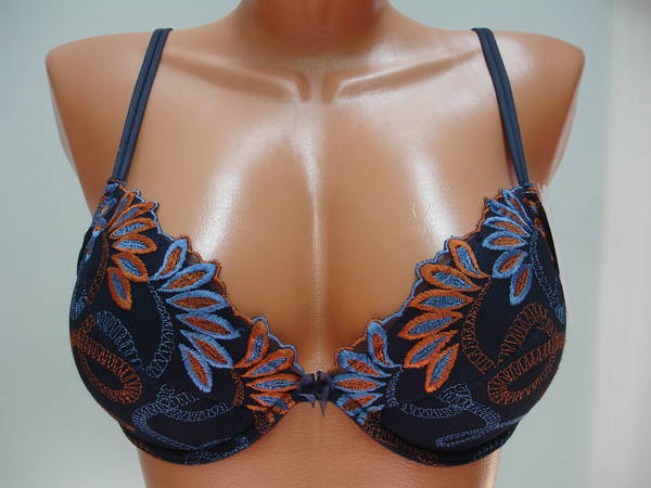 Бюстгальтер "пуш-ап" на тонкой перемычке, с диагональным швом и чашечкой на тонкой поролоновой основе, сверху обтянутой эластичным кружевным полотном, на каркасах. Нижняя деталь с внутренней стороны с кармашком из хлопкового трикотажа, для вкладышей (съемные подушечки). Бочка и спинка выполнены из эластичного сетчатого полотна. Высота бочка 6- 7см. Регулятор длинны бретели спереди. Застежка на одном крючке, два варианта объема. Между чашечками на стане украшен маленьким бантиком.