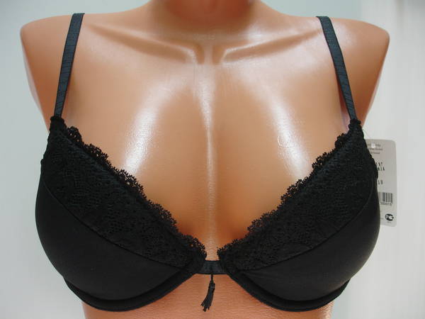 Бюстгальтер "пуш-ап" на тонкой перемычке, с диагональным швом и чашечкой на тонкой поролоновой основе, на каркасах. Верхняя деталь обтянута эластичным кружевным полотном, нижняя деталь обтянута эластичным полотном с внутренней стороны с кармашком из хлопкового трикотажа, для вкладышей (съемные подушечки). Бочка и спинка выполнены из эластичного полотна. Высота бочка 6- 7см. Регулятор длинны бретели сзади. Застежка от 75А - 75D,80В на одном крючке, 80С, 80D на два крючка, два варианта объема. Между чашечками на стане украшен маленьким бантиком.