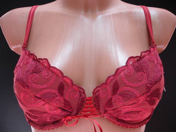 Бюстгальтер "пуш-ап" на средней перемычке с диагональным швом и чашечкой на тонкой поролоновой основе, сверху обтянутой эластичным кружевным полотном, на каркасах. Нижняя деталь с внутренней стороны с кармашком из хлопкового трикотажа, для вкладышей (съемные подушечки). Чашечки бюстгальтера скрепляет очень красивая атласная ленточка. Бюстгальтер имеет съёмные бретели. Бочка и спинка выполнены из эластичного полотна. Высота бочка 7- 9см. Регулятор длинны бретели сзади. Застежка на одном крючке, два варианта объема.