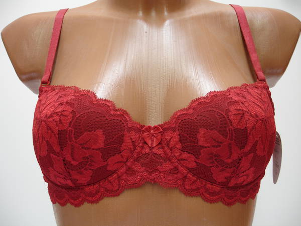 Бюстгальтер "балконет" с Т-образным швом и чашечкой на тонкой поролоновой основе, сверху обтянутой эластичным кружевным полотном, на каркасах. Стан, бочка и спинка выполнены из эластичного кружевного полотна. Высота бочка 6- 9 см. Съемная бретель позволяет адаптировать бюстгальтер практически к любому наряду. Регулятор длинны бретели сзади. Застежка от 75В,75С,75D,80В,80С на одном крючке, от 75Е, 80D - 85D на два крючка, два варианта объема. Между чашечками на стане украшен маленьким бантиком.