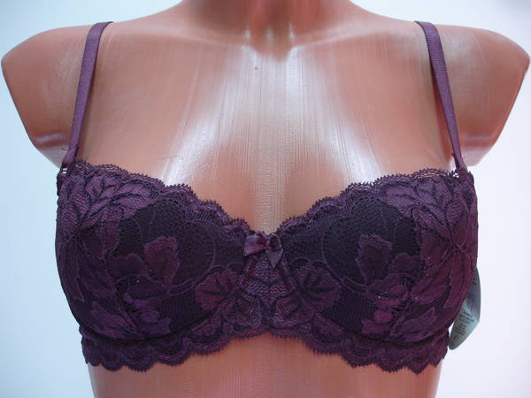 Бюстгальтер "балконет" с Т-образным швом и чашечкой на тонкой поролоновой основе, сверху обтянутой эластичным кружевным полотном, на каркасах. Стан, бочка и спинка выполнены из эластичного кружевного полотна. Высота бочка 6- 9 см. Съемная бретель позволяет адаптировать бюстгальтер практически к любому наряду. Регулятор длинны бретели сзади. Застежка от 75В,75С,75D,80В,80С на одном крючке, от 75Е, 80D - 85D на два крючка, два варианта объема. Между чашечками на стане украшен маленьким бантиком.