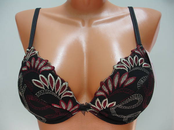 Бюстгальтер "пуш-ап" на тонкой перемычке, с диагональным швом и чашечкой на тонкой поролоновой основе, сверху обтянутой эластичным кружевным полотном, на каркасах. Нижняя деталь с внутренней стороны с кармашком из хлопкового трикотажа, для вкладышей (съемные подушечки). Бочка и спинка выполнены из эластичного сетчатого полотна. Высота бочка 6- 7см. Регулятор длинны бретели спереди. Застежка на одном крючке, два варианта объема. Между чашечками на стане украшен маленьким бантиком.