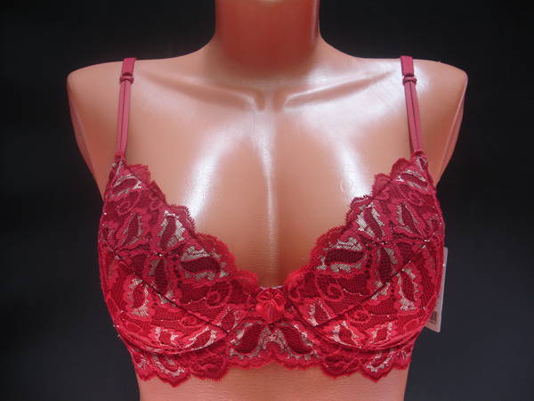 Бюстгальтер "балконет" с диагональным швом и чашечкой на тонкой поролоновой основе, сверху обтянутой эластичным кружевным полотном, на каркасах. Стан, бочка и спинка выполнены из эластичного кружевного полотна. Стан продублирован изнутри хлопковой основой. Высота бочка 7-10 см. Регулятор длинны бретели сзади. Застежка на одном крючке, два варианта объема. Между чашечками на стане украшен маленьким бантиком.