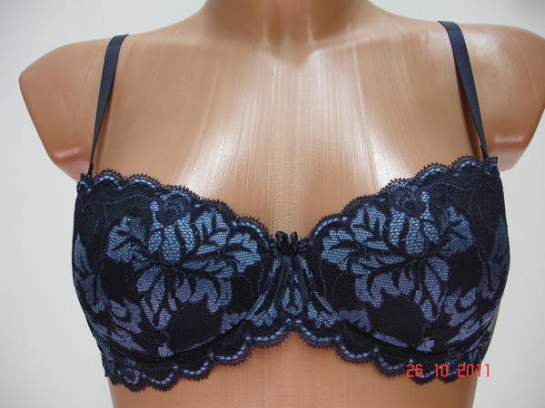 Бюстгальтер "балконет" с Т-образным швом и чашечкой на тонкой поролоновой основе, сверху обтянутой эластичным кружевным полотном, на каркасах. Стан, бочка и спинка выполнены из эластичного кружевного полотна. Высота бочка 6- 9 см. Съемная бретель позволяет адаптировать бюстгальтер практически к любому наряду. Регулятор длинны бретели сзади. Застежка от 75В,75С,75D,80В,80С на одном крючке, от 75Е, 80D - 85D на два крючка, два варианта объема. Между чашечками на стане украшен маленьким бантиком.