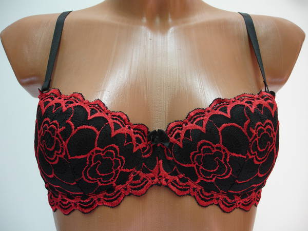 Бюстгальтер "балконет" с Т-образным швом и чашечкой на тонкой поролоновой основе, сверху обтянутой эластичным кружевным полотном, на каркасах. Стан, бочка и спинка выполнены из эластичного кружевного полотна. Высота бочка 6- 9 см. Съемная бретель позволяет адаптировать бюстгальтер практически к любому наряду. Регулятор длинны бретели сзади. Застежка от 75В,75С,75D,80В,80С на одном крючке, от 75Е, 80D - 85D на два крючка, два варианта объема. Между чашечками на стане украшен маленьким бантиком.