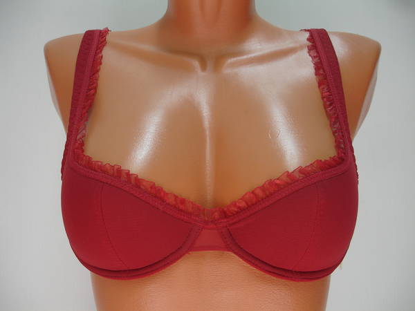 Бюстгальтер гладкий на средней перемычке с Т-образным швом и чашечкой на тонкой поролоновой основе, на каркасах. Стан, бочка и спинка выполнены из эластичного сетчатого полотна. Бюстгальтер имеет широкие разгрузочные бретели не сворачивающиеся и не стесняющие движений, которые снимают напряжение в области плеч и шеи благодаря уплотненной вставке из тонкого поролона. Бретель обтянута основной тканью. Задняя часть бретели выполнена из эластичной тесьмы. Регулятор длинны бретели сзади. Высота бочка 5 - 8 см. Застежка на одном крючке, два варианта объема. Сверху по краю до середины бретели, бюстгальтер украшен очень красивой рюшей.