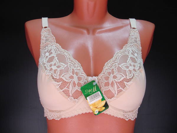 Бюстгальтер с мягкой чашечкой и диагональным швом из эластичного кружевного полотна и эластичного полотна, на каркасах. Нижняя часть чашечки продублирована изнутри хлопковой основой. Стан и спинка выполнены из эластичного полотна. Стан продублирован изнутри хлопковой основой. Бочка выполнены из эластичного кружевного полотна и продублированы изнутри сетчатой основой. Высота бочка 9-11 см. Регулятор длинны бретели сзади. Застежка на два кручка, два варианта объема. Между чашечками на стане украшен маленьким бантиком.